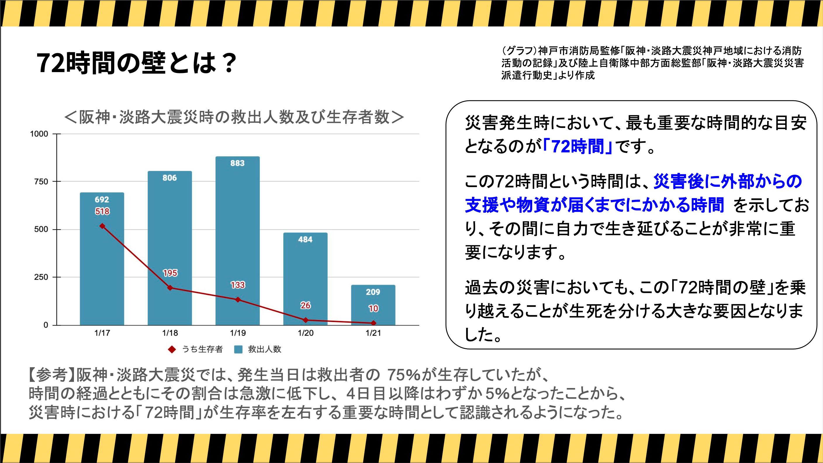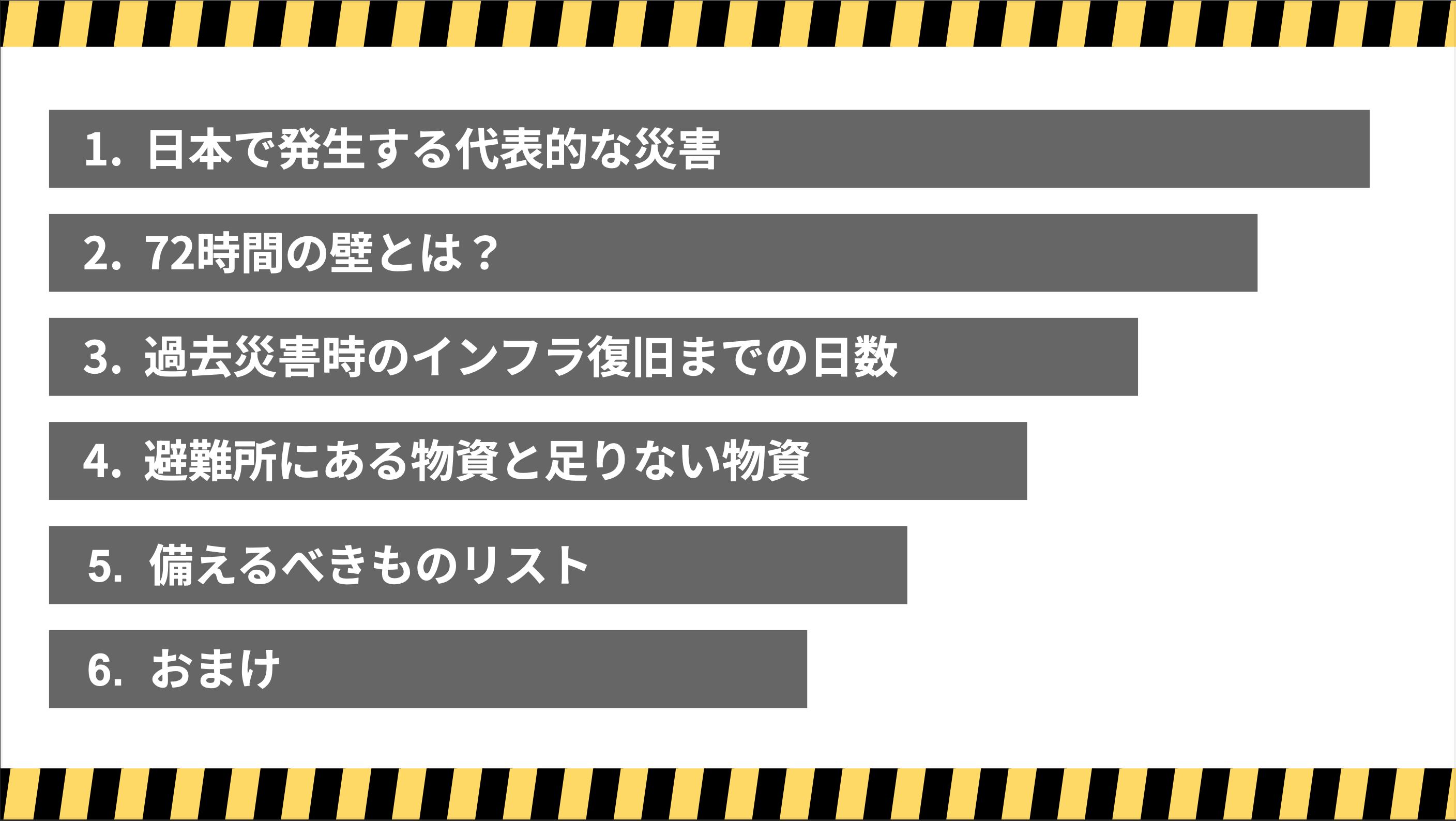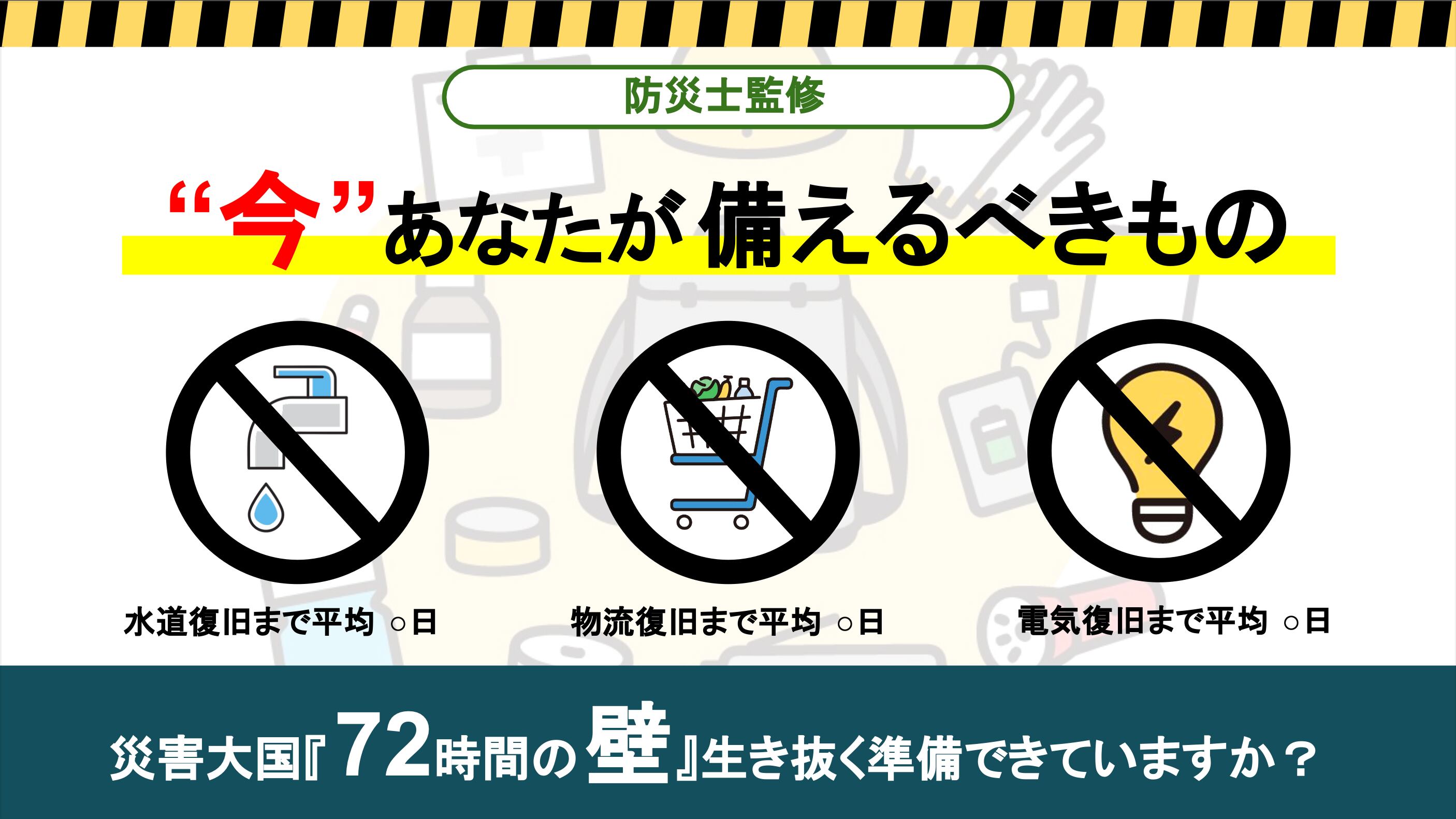 さらに、阪神淡路・東日本・熊本など過去の災害データに基づき、実際にライフラインがどれだけの期間停止するのか、そして家庭内で何をどれだけ備えるべきかを、わかりやすくリスト化しました。